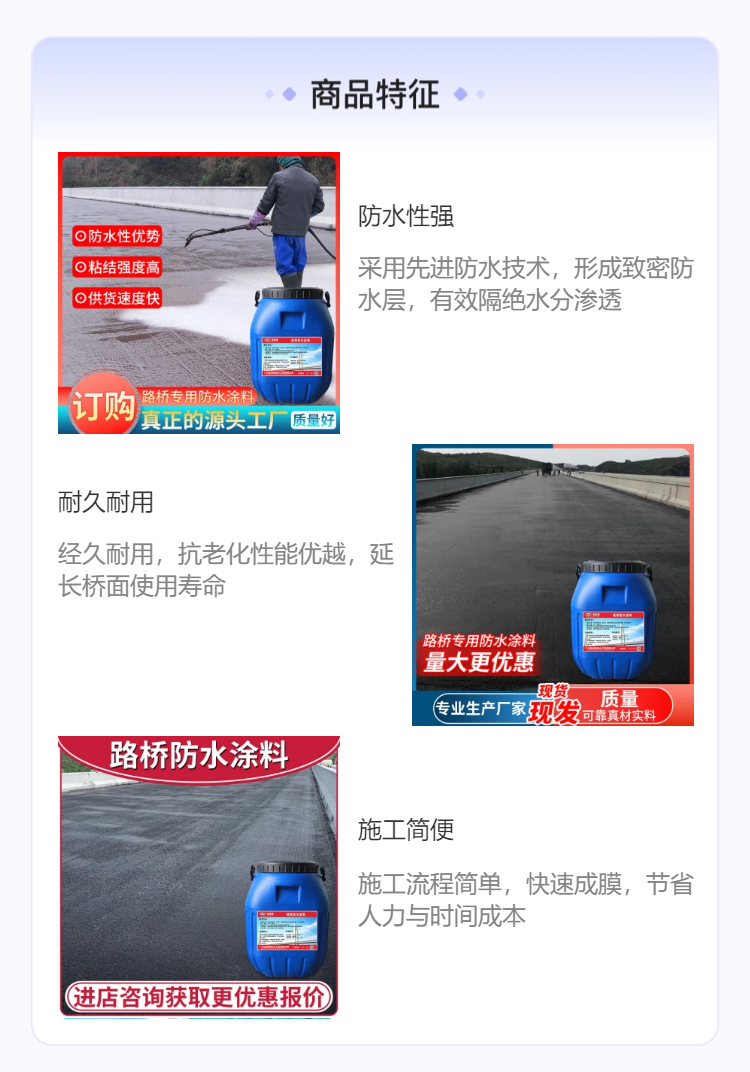 防水性能优异:该涂料固化后可形成连续无缝的致密防水膜,渗水系数为零,能有效抵御水分渗透,防止桥面渗水导致的钢筋锈蚀,保护桥梁结构不受水的侵蚀。