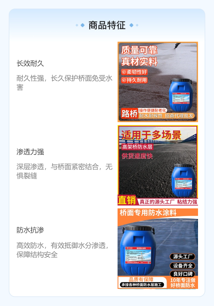 大型跨江跨河桥梁防水粘结层是桥面铺装与混凝土桥面板间的关键屏障,改性乳化沥青凭借良好粘结性、耐水性、抗裂性与施工便捷性,成为主流材料。专项施工需严格遵循 “基层处理→材料施工→质量控制→成品保护” 全流程,适配重载、高湿、温差大的复杂环境,保障桥梁耐久性。
