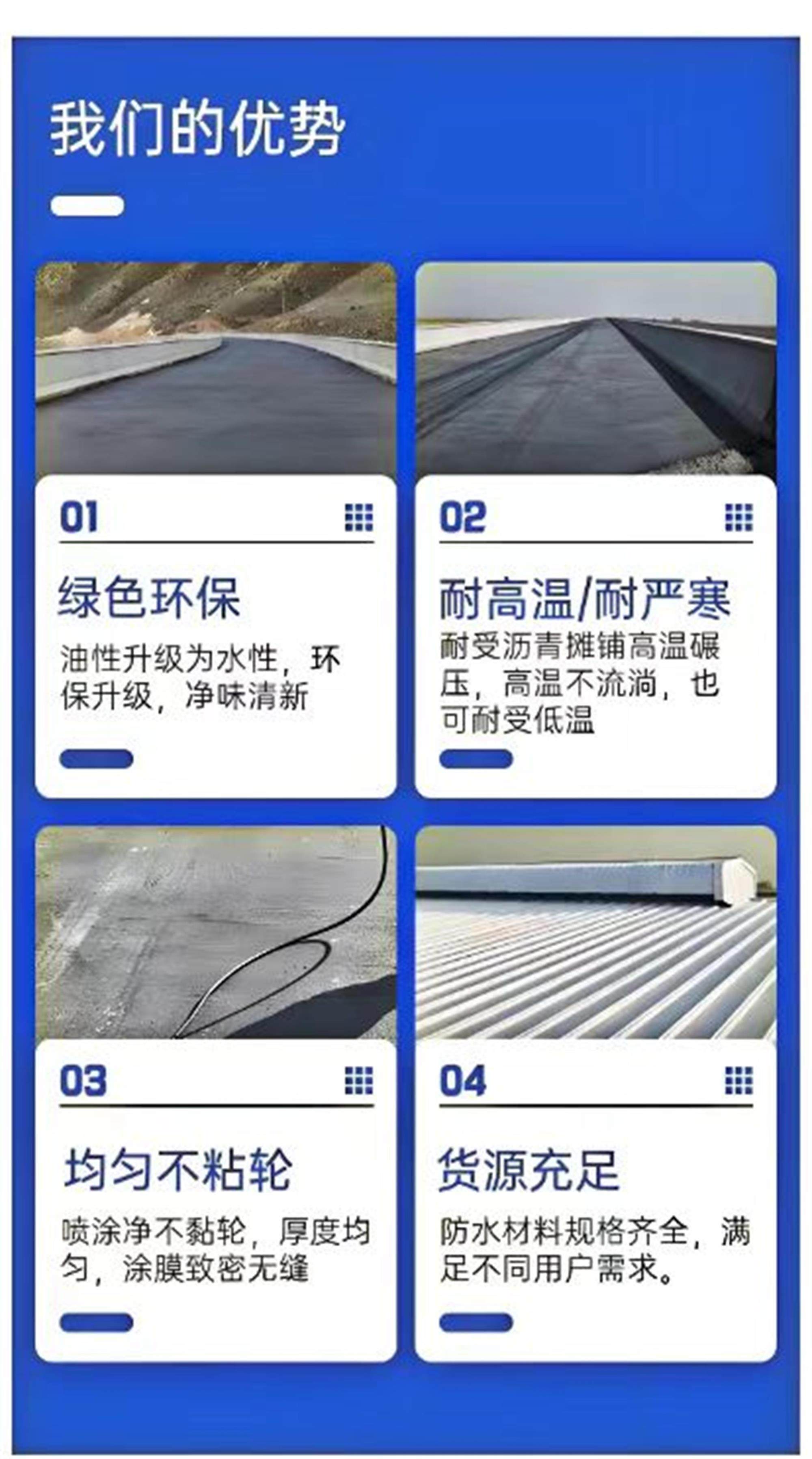 快速固化:表干快、成膜致密,48h 可铺沥青,缩短工期;