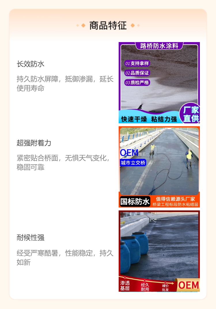 纤维增强聚合物改性沥青防水涂料为例,其需符合 JC/T975-2005《道桥用防水涂料》标准要求,如固体含量≥50%,表干时间≤6h,实干时间≤7h,与水泥混凝土粘结强度≥0.60MPa,耐热度 160℃无流淌、滑动、滴落,拉伸强度≥1.00MPa,断裂延伸率≥800%,低温柔度 - 25℃无裂纹等。