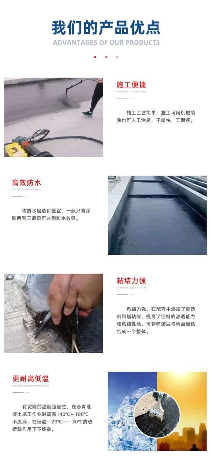- 耐久性强降低维护成本:通过多种添加剂和乳化剂的协同作用,该涂料在耐紫外线、耐热、耐酸碱、耐水等方面表现优异,且疲劳试验可超 120 万次,能适应道桥长期暴露在户外的复杂环境。另外其储存保质期达两年以上,不易离析变质,减少了材料存放不当造成的损耗;而长效的防水和防护性能,还能减少道桥频繁维修的频次,长期来看大幅降低了整体维护成本。